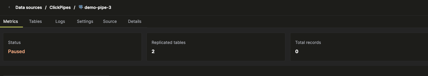 1. На вкладке Data Sources нажмите на Postgres ClickPipe, который вы хотите возобновить. Статус зеркала должен быть Paused изначально.
